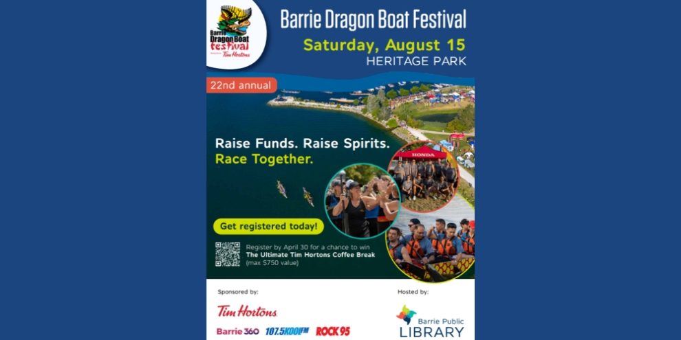 The Barrie Public Library is the proud host of the Barrie Dragon Boat Festival held annually in beautiful Heritage Park. The festival brings teams together for a fun-filled day of camaraderie and fundraising while racing dragon boats on Kempenfelt Bay.