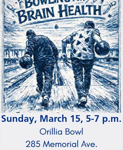 The Alzheimer Society of Simcoe County is hosting a bowling fundraiser event called Bowling for Brain Health on Sunday, March 15th, 2026 – meet us at the Orillia Bowling Alley from 5pm to 7pm for glow-in-the-dark bowling.