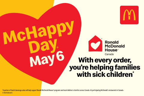 ▪ Every purchase all day on Wednesday, May 6, supports families staying at Ronald McDonald House across Canada, and other local children’s
